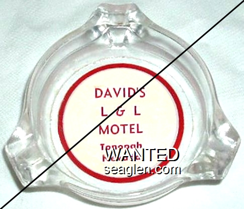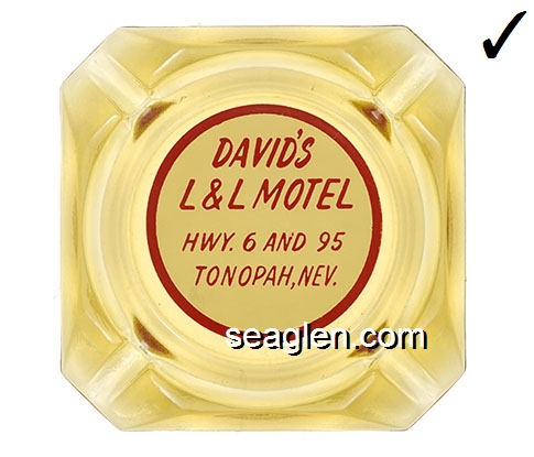DLL-A1 David L & L Motel Tonopah, NV 3 1/2" Amber Glass Ashtray Red on white imprint: David's L&L Motel, Hwy. 6 and 95, Tonopah, Nev. |