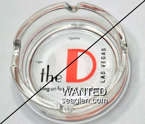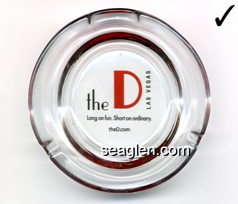 DLV-A1 D Las Vegas, The Las Vegas, NV 4 1/2" Clear Glass Ashtray Black and orange imprint: the D Las Vegas, Long on fun. Short on ordinary., theD.com |
