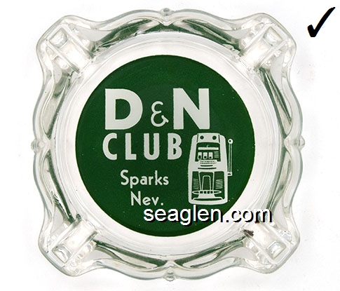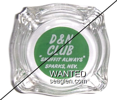 DNC-A1 D and N Club Sparks, NV 3 11/16" Clear Glass Ashtray White on green imprint: D & N Club, Sparks, Nev. |