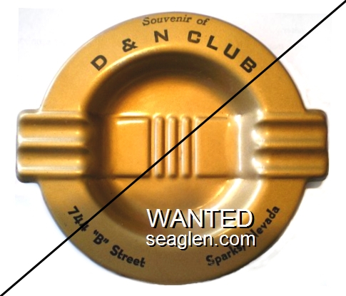DNC-B1 D and N Club Sparks, NV 4 1/4" Gold Metal Ashtray Black imprint: Souvenir of D & N Club, 744 ''B'' Street, Sparks, Nevada |