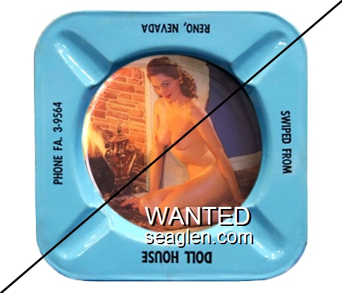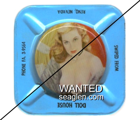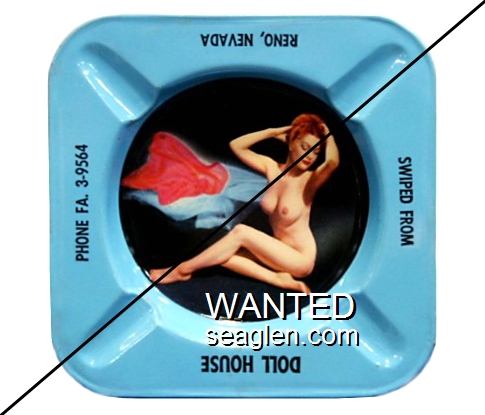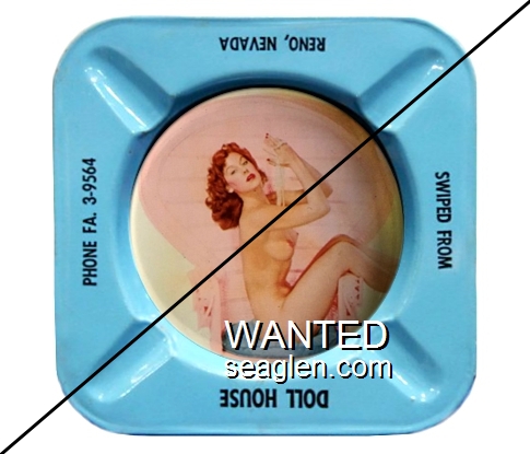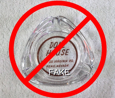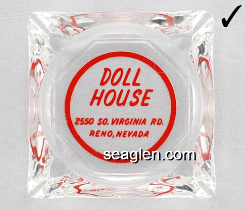 DOL-91 Doll House (Reno) Reno, NV 3 7/16" Clear Glass Ashtray Red silkscreen imprint: Doll House, 2550 So. Virginia Rd., Reno, Nevada (A silk screened fake, sold on eBay by seller greencOkecollector) |