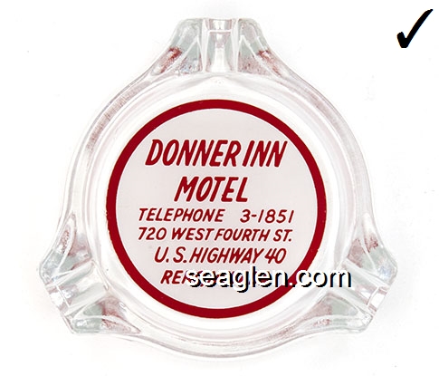 DON-A1 Donner Inn Reno, NV 3 1/4" Clear Glass Ashtray Red on white imprint: Donner Inn Motel, Telephone 3-1851, 720 West Fourth St., U.S. Highway 40, Reno, Nevada |