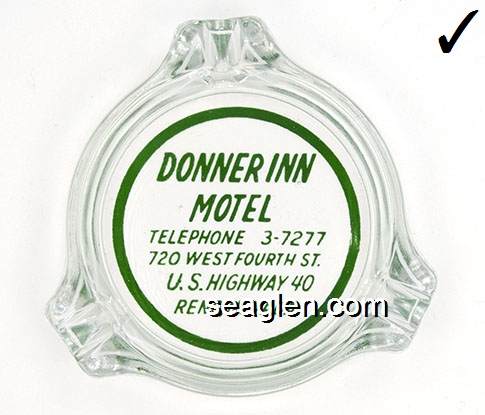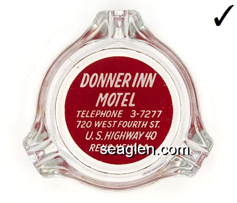 DON-A3 Donner Inn Reno, NV 3 1/4" Clear Glass Ashtray White on red imprint: Donner Inn Motel, Telephone 3-7277, 720 West Fourth St., U.S. Highway 40, Reno, Nevada |
