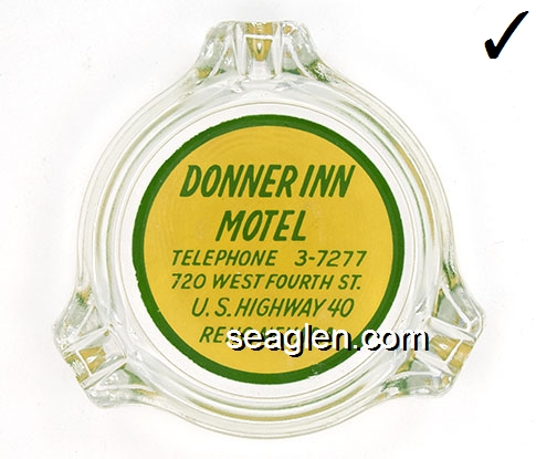 DON-A4 Donner Inn Reno, NV 3 1/4" Clear Glass Ashtray Green on yellow imprint: Donner Inn Motel, Telephone 3-7277, 720 West Fourth St., U.S. Highway 40, Reno, Nevada |