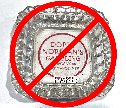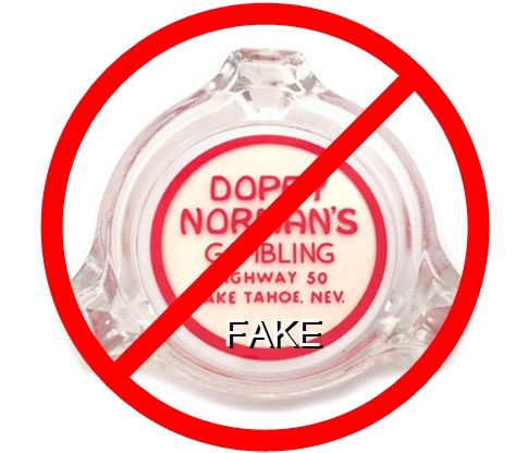 DOP-91 Dopey Norman's Stateline, NV 3 1/4" Clear Glass Ashtray Red silkscreen imprint: Dopey Norman's, Gambling, Highway 50, Lake Tahoe, Nev. (A suspected reproduction ashtray. Several pristine examples have been sold by the same eBay seller, greencOkecollector, an unscrupulous seller of undisclosed reproduction items.) |