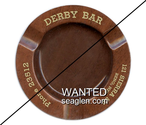 DRB-B1 Derby Bar Reno, NV 4" Brown Metal Ashtray Yellow imprint: Derby Bar, 121 Sierra St., Reno, Nev., Phone 23512 |