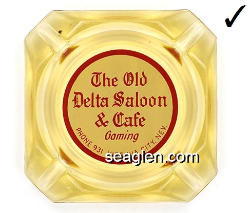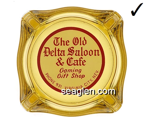 DSC-A1 Delta Saloon & Cafe Virginia City, NV 3 7/16" Amber Glass Ashtray Red on white imprint: The Old Delta Saloon & Cafe, Gaming, Gift Shop, Phone 931, Virginia City, Nev. |