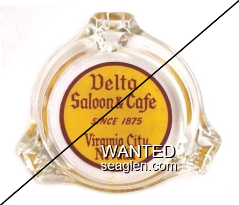 DSC-B1 Delta Saloon & Cafe Virginia City, NV 3 1/2" Clear Glass Ashtray Red on yellow imprint: Delta Saloon & Cafe, Since 1875, Virginia City, Nevada |
