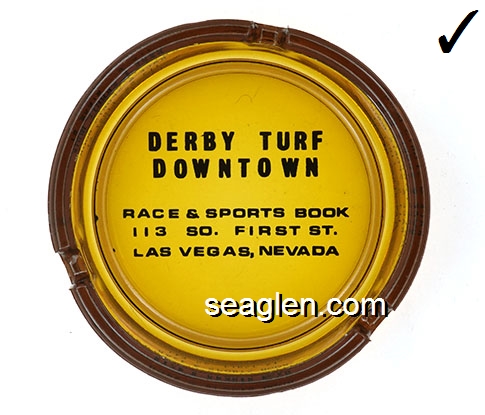 DTC-B1 Derby Turf Club Las Vegas, NV 3 9/16" Amber Glass Ashtray Black imprint: Derby Turf Downtown, Race & Sports Book, 113 So. First St., Las Vegas, Nevada |