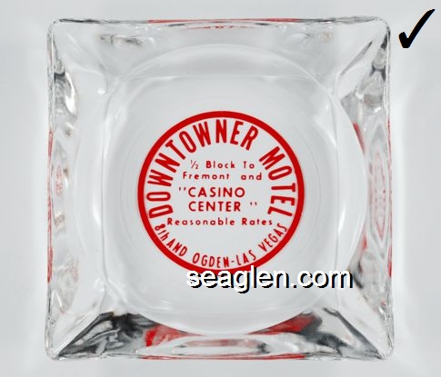 DTR-A1 Downtowner Motel Las Vegas, NV 3 1/2" Clear Glass Ashtray Red imprint: Downtowner Motel, 1/2 Block To Fremont and ''Casino Center'', Reasonable Rates, 8th and Ogden - Las Vegas |
