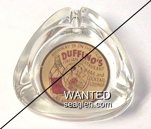 DUF-A1 Duffino's Las Vegas, NV 3 1/2" Clear Glass Ashtray Red and black on tan imprint: Highway 91 on the Strip, Duffino's Italian Restaurant Bar and Cocktail Lounge, Las Vegas, Nevada |