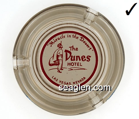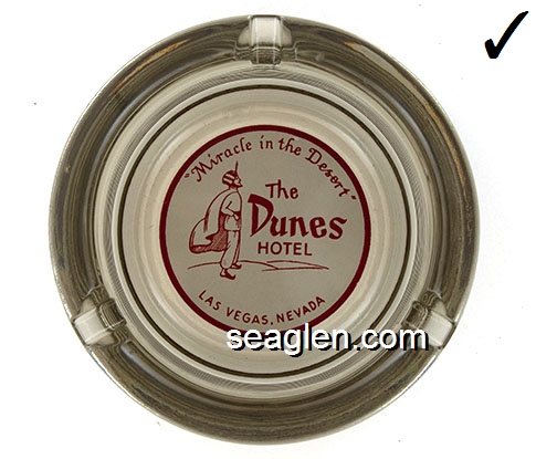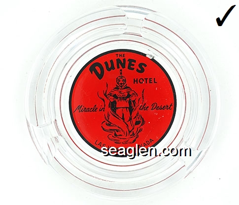 DUN-E2 Dunes Hotel & Country Club Las Vegas, NV 5" Clear Glass Ashtray Red on white imprint: ''A Miracle in the Desert'', The Dunes Hotel, Las Vegas, Nevada |