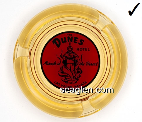 DUN-04 Dunes Hotel & Country Club Las Vegas, NV 4" Amber Glass Ashtray Black on red imprint: The Dunes Hotel, Miracle in the Desert, Las Vegas, Nevada |