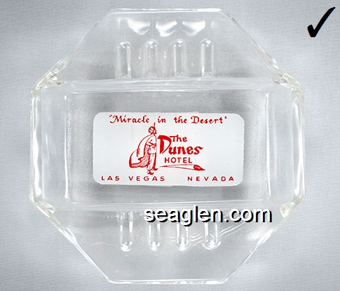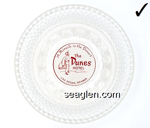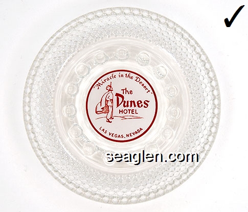 DUN-D1 Dunes Hotel & Country Club Las Vegas, NV 5" Clear Glass Ashtray Red on white imprint: ''A Miracle in the Desert'', The Dunes Hotel, Las Vegas Nevada (SAFEX style) |