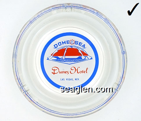 DUN-F1 Dunes Hotel & Country Club Las Vegas, NV 5 3/8" Clear Glass Ashtray Blue and red on white imprint: Dome of the Sea, Dunes Hotel, Las Vegas, Nev. |