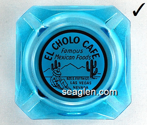 ECC-B1 El Cholo Cafe Las Vegas, NV 3 1/2" Blue Glass Ashtray Red on white imprint: El Cholo Cafe, Famous Mexican Foods, 625 S. Fifth St., Las Vegas, Nevada |