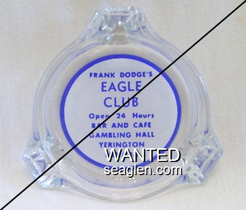 ECY-02 Eagle Club & Cafe Yerington, NV 3 3/8" Clear Glass Ashtray Blue on white imprint: Frank Dodge's Eagle Club, Open 24 Hours, Bar and Cafe, Gambling Hall, Yerington, Nevada |