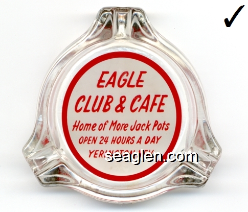 ECY-04 Eagle Club & Cafe Yerington, NV 3 3/8" Clear Glass Ashtray Red on white imprint: Eagle Club & Cafe, Home of More Jack Pots, Open 24 Hours A Day, Yerington, Nev. |