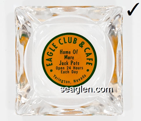 ECY-06 Eagle Club & Cafe Yerington, NV 3 1/2" Clear Glass Ashtray Green on orange imprint: Eagle Club & Cafe, Home of More Jack Pots, Open 24 Hours Each Day, Yerington, Nevada |