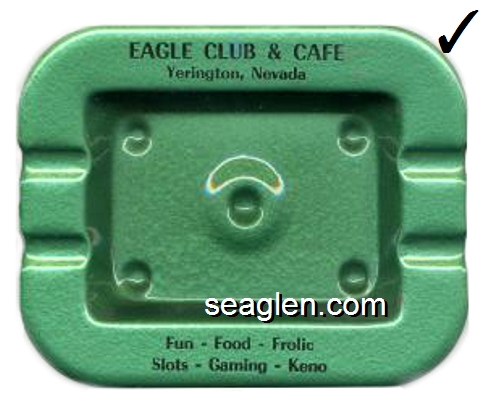 ECY-A1 Eagle Club & Cafe Yerington, NV 5 1/8 x 4 1/8" Green Metal Ashtray Black imprint: Eagle Club & Cafe, Yerington, Nevada, Fun - Food - Frolic, Slots - Gaming - Keno |