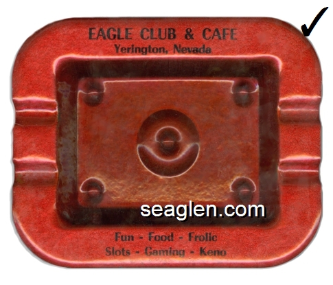 ECY-A2 Eagle Club & Cafe Yerington, NV 5 1/8 x 4 1/8" Red Metal Ashtray Black imprint: Eagle Club & Cafe, Yerington, Nevada, Fun - Food - Frolic, Slots - Gaming - Keno |