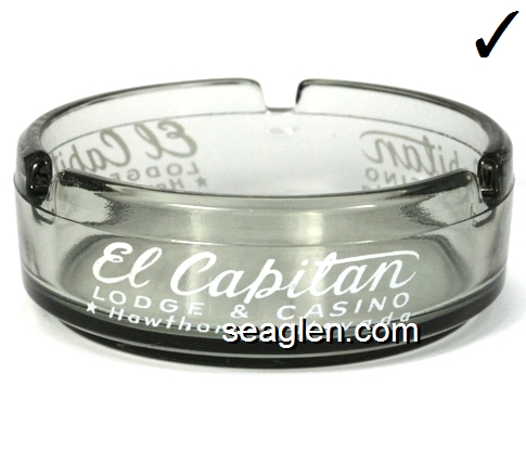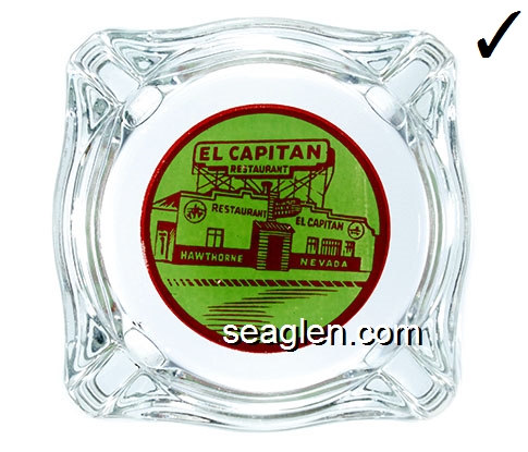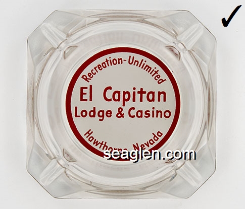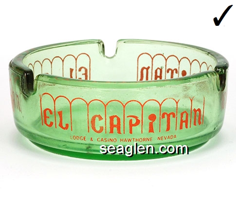 ELC-K1 El Capitan Lodge & Casino Hawthorne, NV 3 1/2" Green Glass Ashtray Red imprint: Barney's New El Capitan Lodge & Casino, Hawthorne, Nevada, 24 ... Sportsman's Headquarters, Hawthorne, Nevada U.S. HWY. 95 (With AAA and Best Western Logos) |