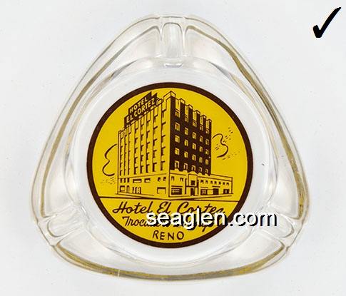 ELC-60 El Cortez (Reno) Reno, NV 3 1/2" Clear Glass Ashtray Brown on yellow imprint: Hotel El Cortez, Trocadero Lounge, Reno |