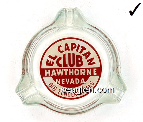 ELC-G1 El Capitan Lodge & Casino Hawthorne, NV 3 1/2" Clear Glass Ashtray Red on white imprint: El Capitan Club Hawthorne Nevada, Big Tender Steaks |