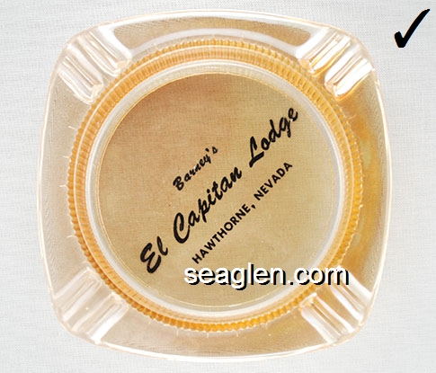 ELC-A1 El Capitan Lodge & Casino Hawthorne, NV 3 1/4" Amber Glass Ashtray White on red imprint: ''Barney's'' El Capitan Lodge, Hawthorne, Nev. |