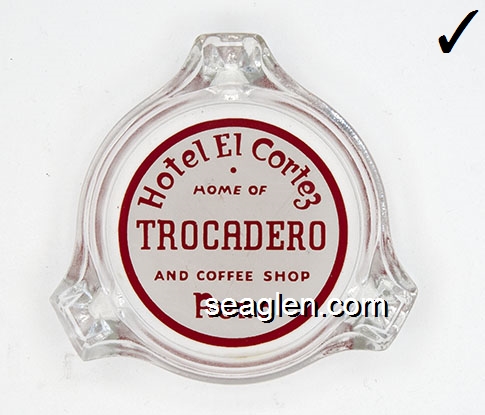 ELC-Y1 El Cortez (Reno) Reno, NV 3 3/8" Clear Glass Ashtray Red on white imprint: Hotel El Cortez, Home of Trocadero and Coffee Shop, Reno |