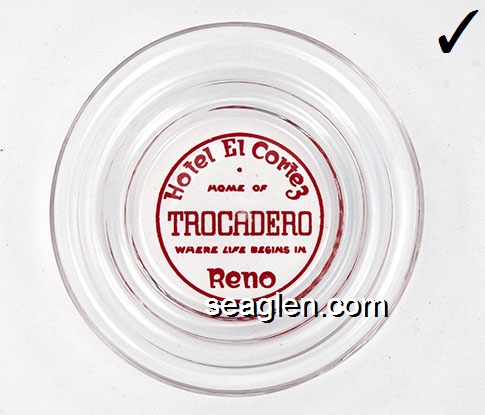 ELC-Y4 El Cortez (Reno) Reno, NV 3 3/8" Clear Glass Ashtray Red on white imprint: Hotel El Cortez, Home of Trocadero, Where Life Begins In, Reno |