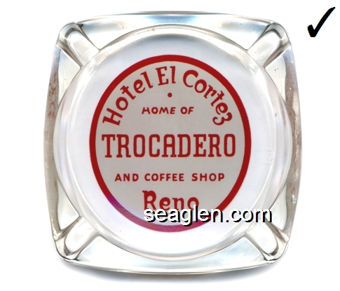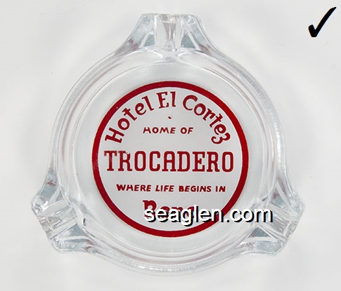 ELC-Y2 El Cortez (Reno) Reno, NV 4" Clear Glass Ashtray Red imprint: Hotel El Cortez, Home of Trocadero, Where Life Begins in Reno |