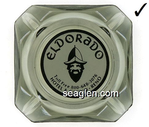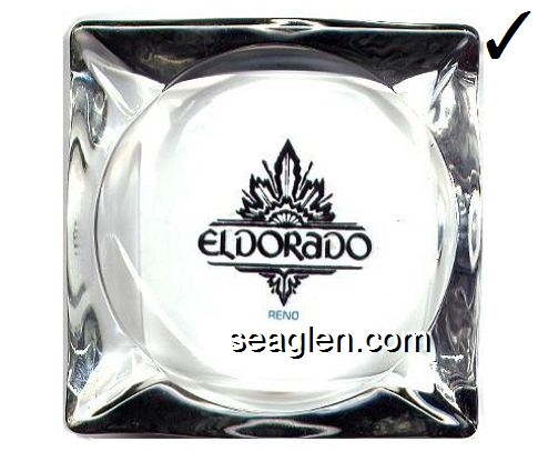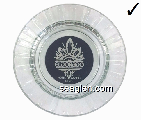 ELD-C4 Eldorado Hotel & Casino Reno, NV 3 1/2" Clear Glass Ashtray Black on white imprint: Eldorado, Toll Free 800-648-3076, Hotel & Casino Reno (Like ELD-11, except clear glass) |