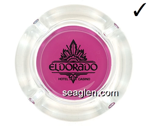 ELD-G1 Eldorado Hotel & Casino Reno, NV 4 1/2" Clear Glass Ashtray Black on pink imprint: Eldorado, Hotel Casino |
