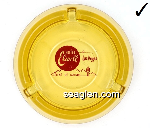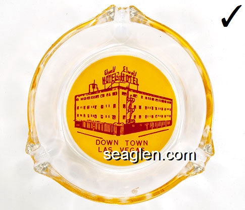 ELW-A1 Elwell Hotel Las Vegas, NV 4 1/2" Clear Glass Ashtray Red on yellow imprint: Hotel Elwell, Down Town, Las Vegas |
