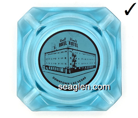 ELW-C1 Elwell Hotel Las Vegas, NV 3 1/2" Blue Glass Ashtray Red on white imprint: Hotel Elwell, Downtown Las Vegas |