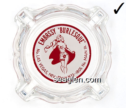 EMB-A1 Embassy Club Las Vegas, NV 3 11/16" Clear Glass Ashtray Red on White imprint: Embassy ''Burlesque'', No. Las Vegas, Nev. - Phone 1633 - 1805 No. Main St. |