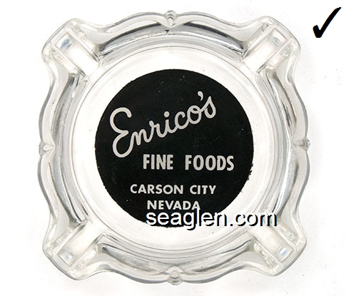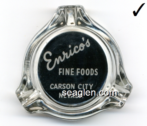 ENR-A1 Enrico's Dinner House Carson City, NV 3 1/2" Clear Glass Ashtray White on black imprint: Enrico's Fine Foods, Carson City, Nevada |