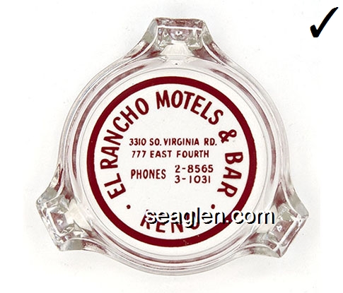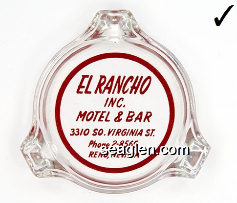 ELD-D2 Eldorado Hotel & Casino Reno, NV 3 1/2" Clear Glass Ashtray White on maroon imprint: Eldorado, Hotel Casino, Reno (Like ELD-15, except Style A and white on maroon imprint) |