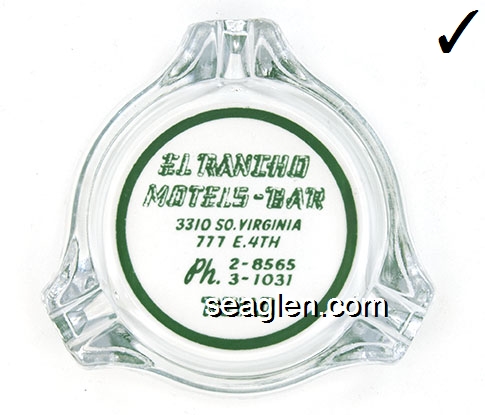 ELC-L1 El Capitan Lodge & Casino Hawthorne, NV 3 1/2" Green Glass Ashtray Red imprint: El Capitan Lodge & Casino, Hawthorne, Nevada, (With AAA & Best Western logos) (Like ELC-14, except with additional logos) |