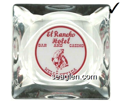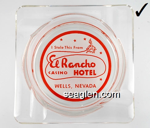 ELC-E2 El Capitan Lodge & Casino Hawthorne, NV 3 11/16" Clear Glass Ashtray White on red imprint: Home of Big Jackpots, El Capitan Club, Hawthorne, Nev., Sportsman's Headquarters (Like ELC-02, except imprint not scalloped) |