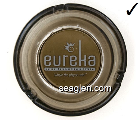 EUC-C1 Eureka Casino-Hotel Mesquite, NV 4 1/4" Smoke Glass Ashtray White imprint: eureka, casino . hotel . mesquite - nevada . , '''where the players win!'' |