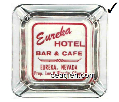 EUH-A1 Eureka Hotel Eureka, NV 4" Clear Glass Ashtray Red imprint: Eureka Hotel Bar & Cafe, Eureka, Nevada, Prop. Lee & Blanche Olinger |