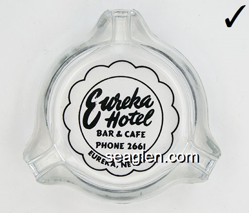 EUH-B1 Eureka Hotel Eureka, NV 3 1/2" Clear Glass Ashtray Black imprint: Eureka Hotel, Bar & Cafe, Phone 2661, Eureka, Nevada |