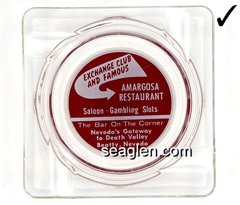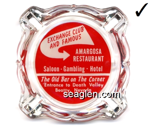 EXC-A1 Exchange Club Beatty, NV 3 11/16" Clear Glass Ashtray Red and white imprint: Exchange Club and Famous Amargosa Restaurant, Saloon - Gambling ... Bar on The Corner, Entrance to Death Valley, Beatty, Nevada |