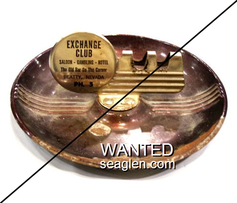EXC-F1 Exchange Club Beatty, NV 5 1/4" Brown Metal Ashtray Black imprint: Exchange Club, Saloon - Gambling - Hotel, The Old Bar On The Corner, Beatty, Nevada, PH. 5 |