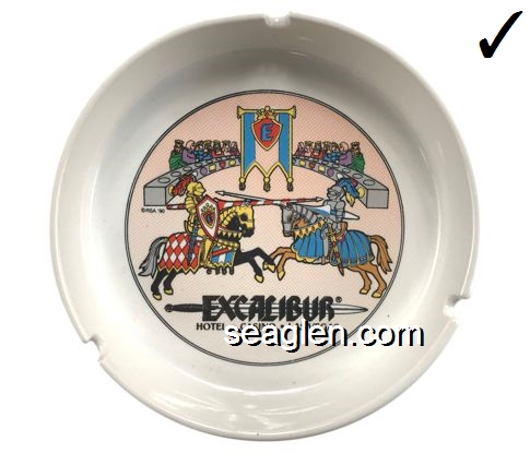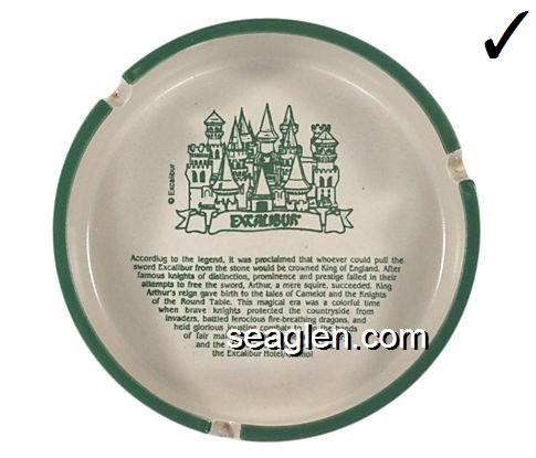 EXC-N4 Excalibur Las Vegas, NV 5" Beige Porcelain Ashtray Green imprint: Excalibur, According to the legend, ... the Magic of Camelot lives on at the Excalibur Motel/Casino! |
