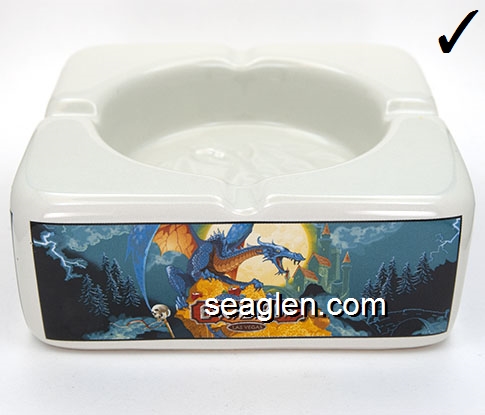 EXC-S1 Excalibur Las Vegas, NV 5 x 5 x 2 1/4" White Porcelain Ashtray Multi imprint: Excalibur, Las Vegas (Bottom: Designed Exclusively for Excalibur, Hotel - Casino - Las Vegas, Made in China) |