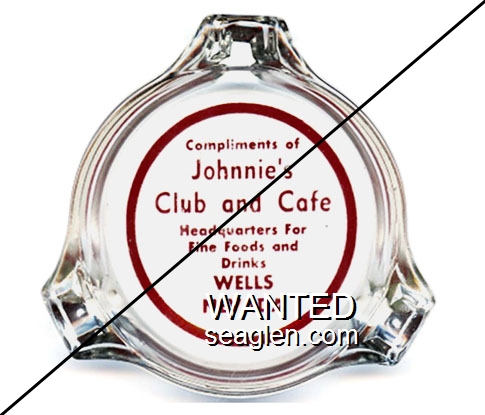 JCW-A1 Johnnie's Club Wells, NV 3 1/2" Clear Glass Ashtray Red imprint: Compliments of Johnnie's Club and Cafe, Headquarters for Fine Foods and Drinks, Wells, Nevada |