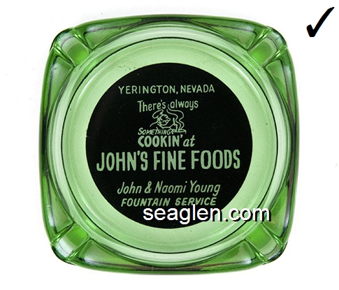JFF-A2 John's Fine Foods Yerington, NV 3 1/4" Green Glass Ashtray Black on white imprint: Yerington, Nevada, There's always Something Cookin' at John's Fine Foods, John & Naomi Young, Fountain Service |
